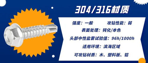 304/316材質較軟。無法攻鉆鐵板,只能攻鉆比較軟的鋁和鋁合金材質板材。若想直接攻鉆鐵板,則要選擇410材質或復合材質的鉆尾螺絲。