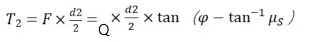 相互配合的螺紋之間受到的是一種復合力的作用,為了分析方便,以矩形螺紋作為研究對象。螺紋副中,螺母所受到的軸向載荷Q沿螺紋各圈平均分布,為便于分析,用集中載荷Q代替,并設Q作用在中徑為d2圓周上的一點。將矩形螺紋沿中徑d2展開,得到斜角等于螺紋升角的斜面。當螺母相對于螺桿等速旋轉時,可看作一個滑塊(螺母)沿著斜面作等速滑動,如圖1。擰緊螺母時,相當于水平推力F推動滑塊沿斜面向上滑動,它的作用方向與d2的圓周相切,運動過程中還受到接觸面的摩擦力Ff、軸向載荷Q。