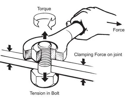 如上圖所示:施加扭矩旋轉螺栓后,螺桿受力伸長了,螺桿伸長產生夾緊力把連接件夾緊了。我們知道,施加的扭矩并不像夾緊力那么簡單,在通用公式中:力(F)*力矩(L)=扭矩M