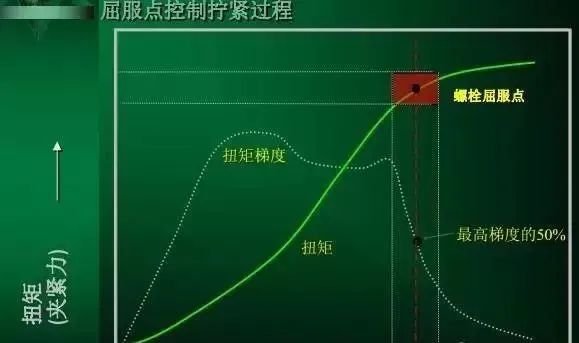 通過上面夾緊力圖即可看出,同樣的轉角誤差在其朔性區的螺栓軸向預緊力誤差ΔF2比彈性區的螺栓軸向預緊力誤差ΔF1要小得多。屈服點控制法就是把螺栓擰緊至屈服點后,停止擰緊的一種方法。它是利用材料屈服的現象而發展起來的一種高精度的擰緊方法。這種控制方法,是通過對擰緊的扭矩/轉角曲線斜率的連續計算和判斷來確定屈服點的。