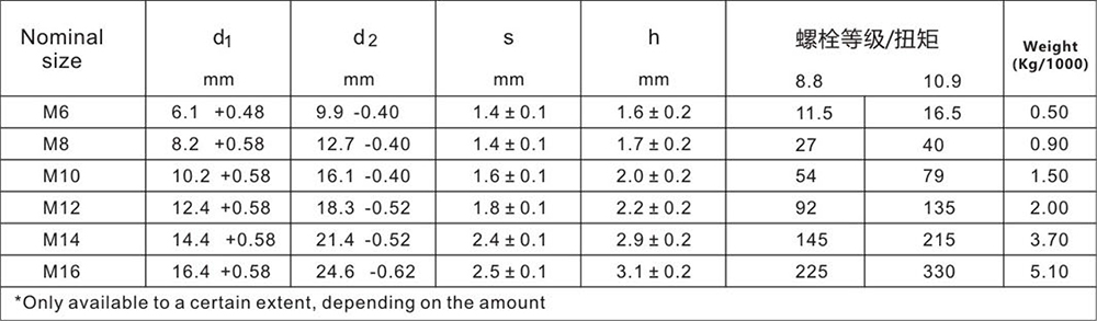 ![]() | 碟形墊圈的升級版,經改良設計后墊圈的防松效果將大增強!在安裝墊片至壓平時,它能保證所擰緊零件上的應力分布均勻。由于墊片上有條痕,它能防止螺釘或螺母的螺紋松動。由于它們具有彈性,可以彌補組裝材料的下沉,使壓力損失降到最小。是一款碟型改良產品質量符合DIN6796標準,工作原理是利用產品在受力后反彈產生的張力起到防松防滑的作用。 如果在裝配中一定要使墊片達到最大的彈性反作用力,最好應用合適的平滑錐形墊片。在安裝條痕錐形墊片時,凹面一定要正對擰緊零件的一側。 “SK”系列帶齒鎖緊墊圈可有效防止螺紋松動,其通過特殊幾何形狀的鎖緊邊緣,有效避免螺栓連接面的損壞,應對扭矩變化帶來的影響;墊圈表面增加了S型齒紋以提高防松系數,“SK”系列法式鎖緊墊圈有四中不同型號:SKS - SKM - SKB - SKZ,均具有優秀的防松鎖緊性能。 型號:S型(?。?,M型(中),B型(大),Z型(圓柱頭螺栓使用) SKZ法式鎖緊墊圈執行標準化生產,常用M6-M16備有現貨庫存式銷售。主要鋼質:S60C.C67S、合金鋼等。硬化等級:HRC42-45。符合14.9高強度級別,表面處理:機械鋅與達克羅處理,經有效測試1000小時以上,完全符合歐盟ROHS標準。 |