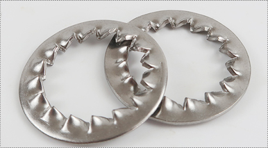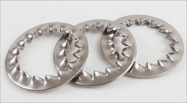 鋸齒鎖緊墊圈是單獨的一個環形墊圈,開口是錯位的,當上緊螺母的時候,錯開口的尖牙,上面的鋸齒會鑲嵌到構件表面,起到防止螺母松動的作用。